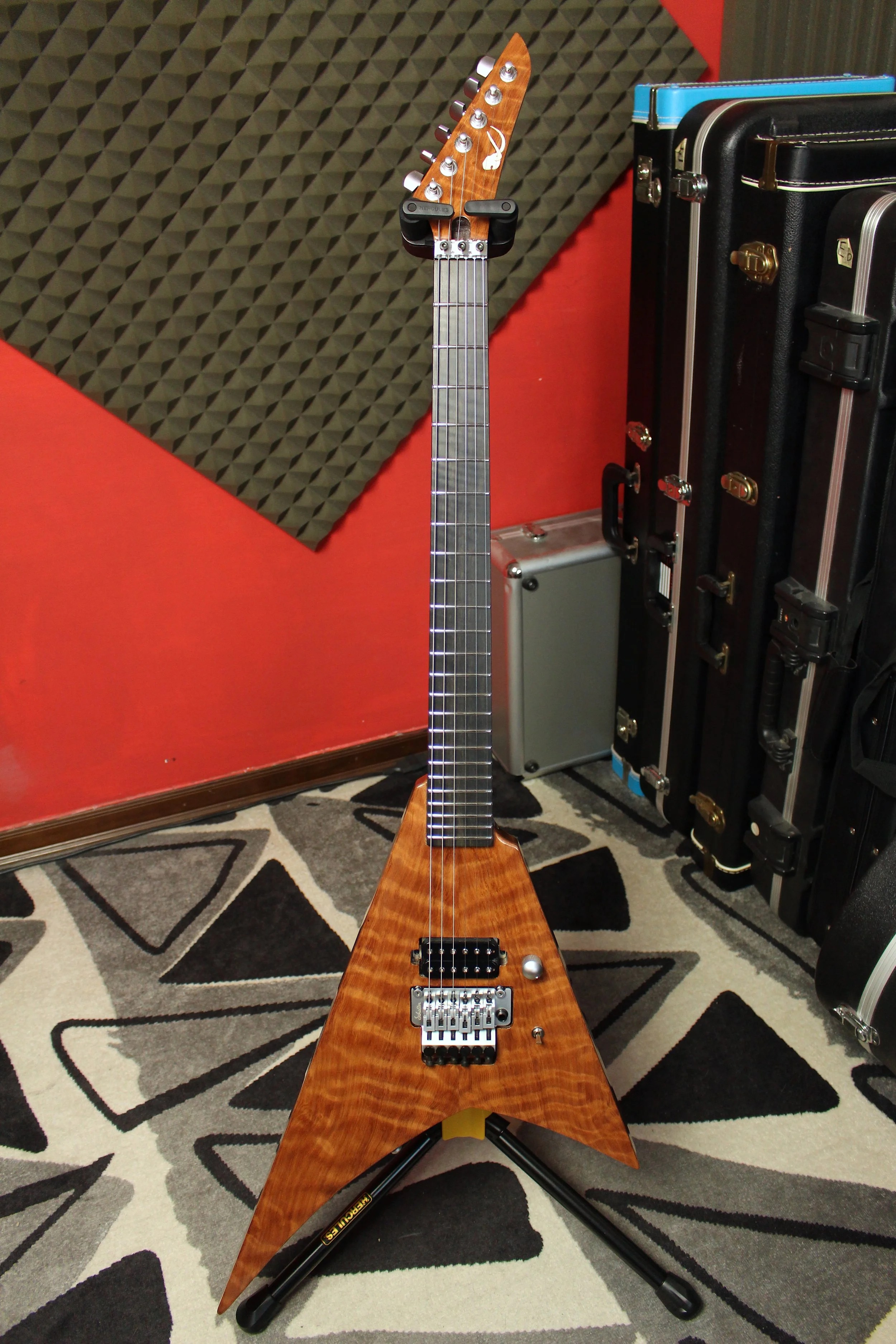This design doesn’t need much introduction: no one can debate the fact that the most iconic metal guitars came from the 80s and this model follow the steps of the classic asymmetrical V, with some modern touches. Higher fret access and set neck, angled bevels and 2 pieces bookmatched body, this one was the first set-neck Klesa guitar I’ve made. My love for the V guitars has been present since I was a kid and the Hati model came out because of it, almost as a visceral need.